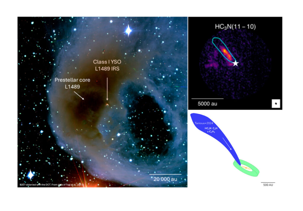 Top Right: Emission of the molecule HC3N mapped toward L1489 IRS using the NOEMA interferometer and the IRAM 30-meter telescope. The accretion streamer connecting the protostar to the nearby prestellar core is marked in cyan.
