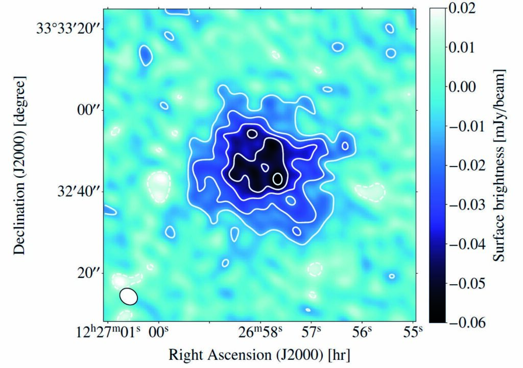 Thermal Sunyaev–Zel’dovich (tSZ) effect detected by NOEMA toward the distant galaxy cluster CL J1226.9+3332. The dark blue and black region at the centre shows the tSZ signal, a dimming of the cosmic microwave background (CMB) caused by scattering from the hot electrons that fill the cluster. These high-resolution NOEMA observations trace the pressure of the intracluster gas down to scales of about 15 kpc, revealing a surprisingly flat pressure profile in the cluster’s core.